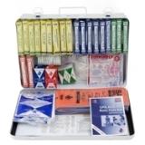 - Kit Includes:(64) Adhesive Bandage, 1" x 3"(2) Adhesive Tape, .5" x 2.5 yd (total)(25) Antibiotic Application, 1 g(50) Antiseptic Towelettes, 5" x 7"(1) Breathing Barrier, 5.5" x 5.5"(2) Burn Dressing (gel soaked), 4" x 4"(25) Burn Treatment, 1 g(2) Cold Pack, 5" x 7"(8) Eye Pads w/Tape(1) Eye/Skin Wash, 4 fl oz(1) First Aid Guide(1) Foil Blanket, 52" x 84"(20) Hand Sanitizer, 1 g(4) Pair Medical Exam Gloves(2) Roller Bandage, 2" x 6 yd(1) Roller Bandage, 4" x 6 yd(1) Scissors(1) Padded Splint, 36"(4) Sterile Pad, 3" x 3"(1) Windlass Tourniquet(4) Trauma Pad, 5" x 9"(6) Triangular Bandage, 40" x 40" x 56"