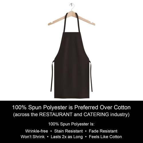 - FEATURES: Our spun poly aprons look neat and have a large surface area to cover you from spills, splashes and stains. Bib aprons have hemmed edges for toughness and durability. Elastic string and adjustable ties make it fit for any body type and is comfortable to use.