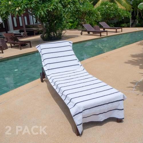 - BEACH CHAIR COVERS ARE BETTER IN PAIRS: Pool goers will be jealous of your matching soft white terry chaise lounge covers. Buy a couple of two packs for the family and stake your claim to the best pool chairs.