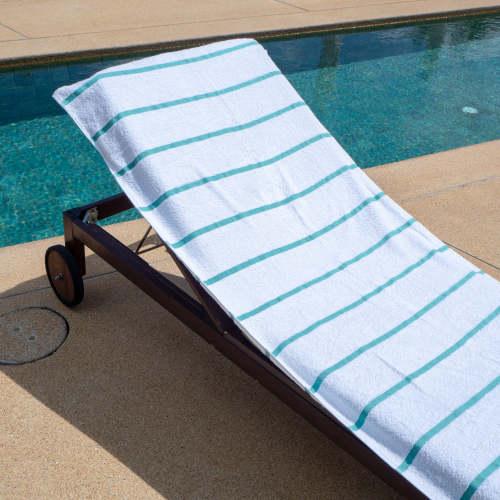 - STYLISH OUTDOOR CHAIR COVERS: These Las Rayas pool chair covers are made with soft 100% premium cotton interwoven with polyester flat woven stripes for a unique look at the beach or pool. Our terry towel pool chair covers match our Las Rayas beach towels.