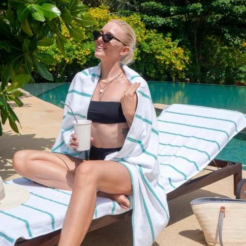 STYLISH OUTDOOR CHAIR COVERS: These Las Rayas pool chair covers are made with soft 100% premium cotton interwoven with polyester flat woven stripes for a unique look at the beach or pool. Our terry towel pool chair covers match our Las Rayas beach towels.