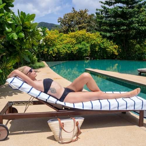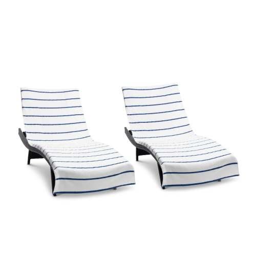 STYLISH OUTDOOR CHAIR COVERS: These Las Rayas pool chair covers are made with soft 100% premium cotton interwoven with polyester flat woven stripes for a unique look at the beach or pool. Our terry towel pool chair covers match our Las Rayas beach towels.