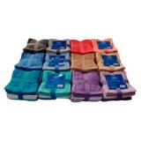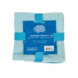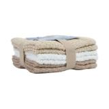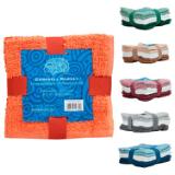 100% Cotton washcloths with a popcorn texture fabric. These tri-color six-packs include two dark washcloths, two in a lighter shade, and two white washcloths between the colors, ribbon-tied with a decorative insert for an eye-catching presentation. Each carton features a controlled assortment of colors including tangerine, green, mocha, burgundy, grey, and teal. Three colors per washcloth pack.