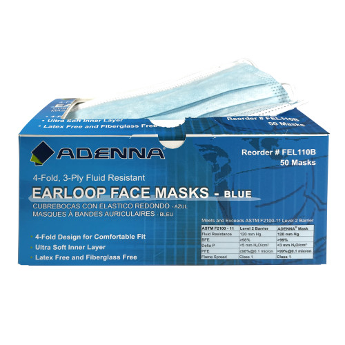 Adenna® brand earloop face masks meet the ASTM F2100-11 requirements as Performance Level 2 Barrier medical face mask.