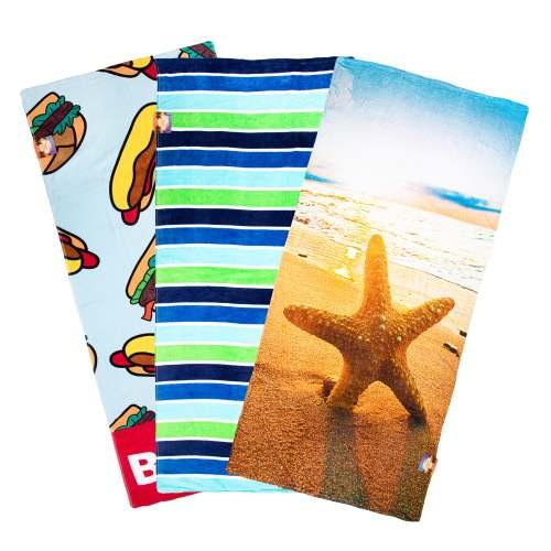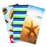 QUALITY: The Fiber Reactive Beach Towel Assortment is a vibrant colorful printed collection of 100% velour cotton towels with fun beach themed graphics. Available in small sizes ranging from 28x58” to 30x60” in case packs of 36. Also available in medium sizes (30x60” to 34x64”) and large sizes (36x68” to 40x70”) in cases of 24