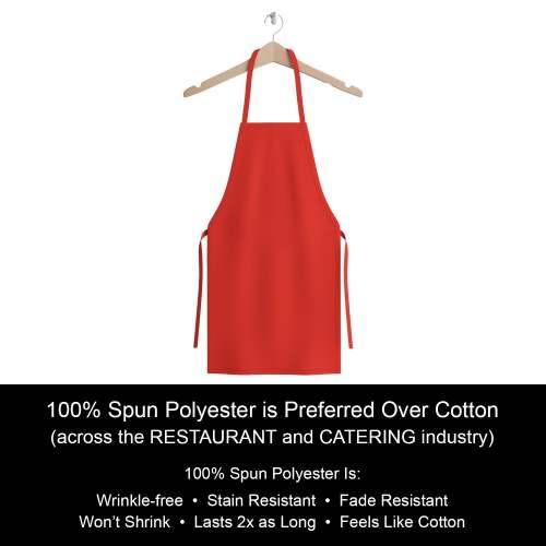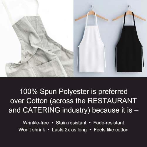- FEATURES: Our spun poly aprons look neat and have a large surface area to cover you from spills, splashes and stains. Bib aprons have hemmed edges for toughness and durability. Elastic string and adjustable ties make it fit for any body type and is comfortable to use.