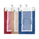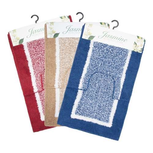 Our Jasmine bath rug sets are made from 100% reprocessed cotton and feature two styles in a soft cut pile with a fabric back. There is a solid color diagonal pattern and a two-toned set with a bold white border. Both styles are available in two styles; a rectangular two-rug set (sizes 18″x29″ and 17″ x23″) and a contour/bath rug set with one 18″ × 29″ rug and a matching 18″ x 18″contour rug. These controlled assortments include six popular décor colors (pictured) and are finished on a sturdy hanger with an eye-catching header card.