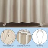 - STRONG SLEEK POLYESTER: A proprietary “Three Proof” fabric treatment enables our 100% polyester jacquard fabric to repel water, stains, and oils from ruining it. This strong 210 GSM polyester shower curtain will stay new-looking and fresh longer than most. A tight weave and durable hem, strong enough to hold hem weights, protect this shower curtain from tearing or stretching out of shape. Fine polyester threads ensure that this polyester fabric has a soft, cotton feel with no scratchy fibers. Metal grommets and heavy-duty rolling shower rings are made from premium quality materials and craftsmanship to ensure the longevity of this shower curtain set.