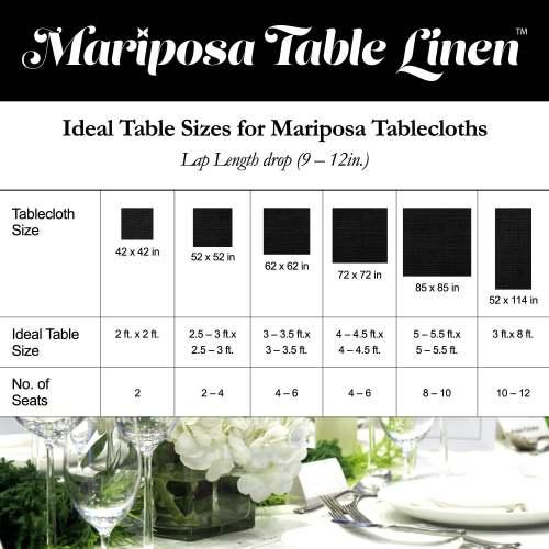 - MULTIPURPOSE: Mariposa tablecloths in sophisticated black and white will compliment any decoration and complete any event planner’s vision perfectly. Weddings, Bar/Bat Mitzvahs, graduation and retirement parties, formal and casual dining events alike — Mariposa table linens are the perfect choice.