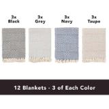 OVERSIZED, NATURAL COTTON THROW BLANKETS: Our cotton blanket throws measure 50" x 70". Much bigger than other standard 50" x 60" blankets. Each case has 12 cozy blankets. There are multiple colors to choose from. All throw blankets are made from the classic herringbone weave.