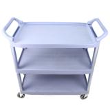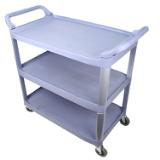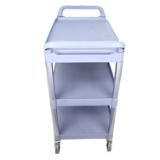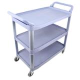 This large three tier bussing cart provides efficient transport and dependable performance in foodservice and commercial facilities. Lightweight yet sturdy, it supports up to 200 lbs. of supplies or dishes. Its durable plastic and metal frame resists scratches, chips, and rust, while textured shelves help prevent items from shifting during use. Rounded corners protect walls and furniture, and 4" heavy-duty casters provide smooth mobility.