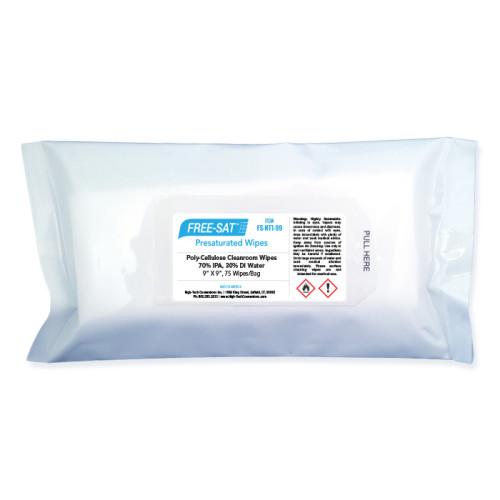 FREE-SAT® FS-NT1-99 are 9 in. x 9 in. wipes pre-saturated with 70% IPA and 30% DI Water. They contain four clean-cut edges made from hydro-entangled nonwoven material composed of 45% polyester and 55% cellulose. They are saturated with 70% IPA, which is the ideal amount for a variety of cleanroom wiping applications.