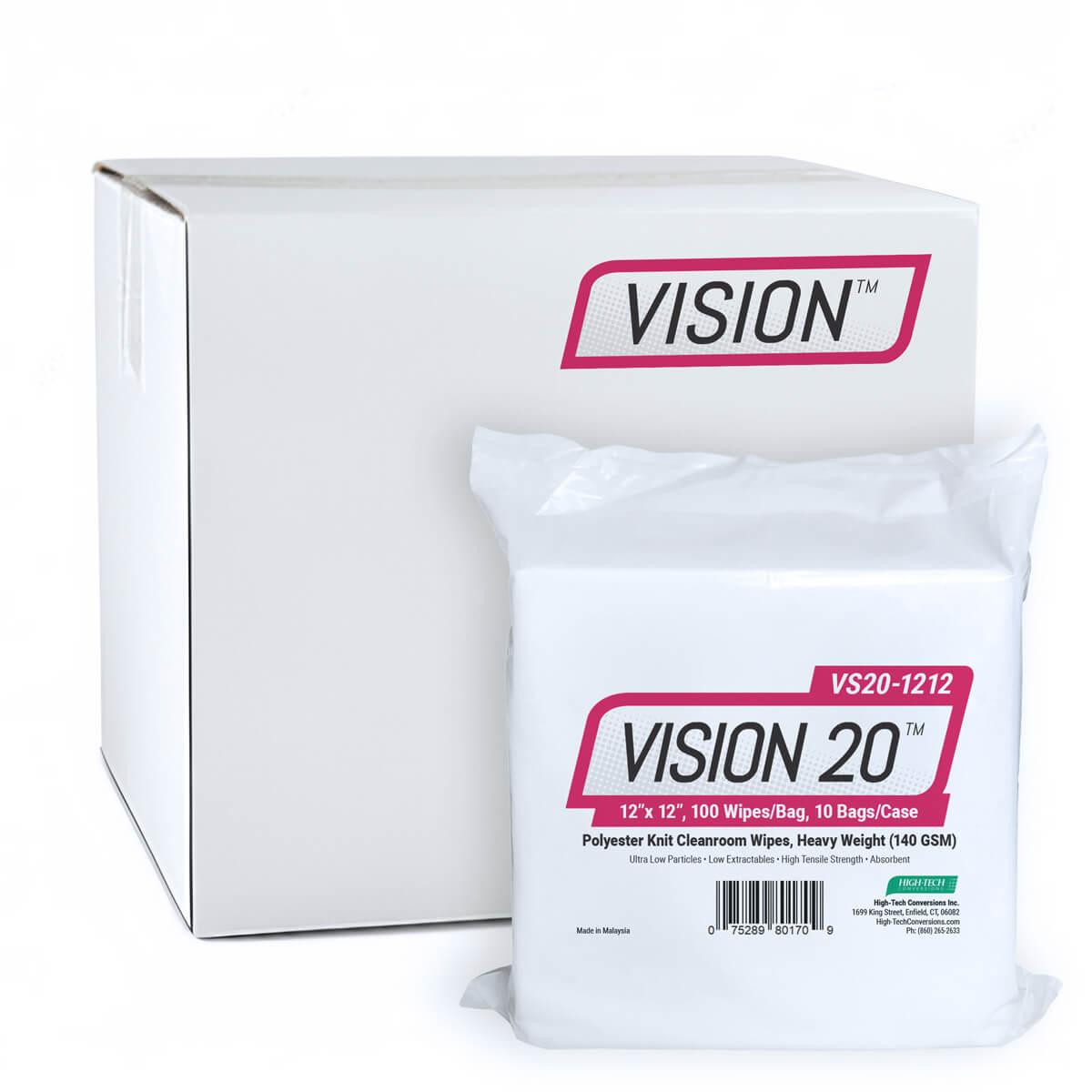 VISION 20™ Polyester Knit, Heavy-Weight (140 gsm) Cleanroom Wipes are extremely low in particle generation and chemical extractables. The fabric consists of premium quality virgin polyester fibers that are continuously filamented throughout the knit construction. VISION 20™ Wipes are knitted on state-of-the-art equipment especially for use in cleanrooms. This fabric undergoes a multitude of special processes that include cleaning, scouring, cutting and a special proprietary cleaning process. Most importantly, VISION 20™ are laundered in a class 100 cleanroom using ultra-filtered water of 0.45 micron purity and HEPA-filtered air during moisture removal. All VISION 20™ Wipes are individually inspected with a lot-to-lot traceability and using ISO 9000 standards.