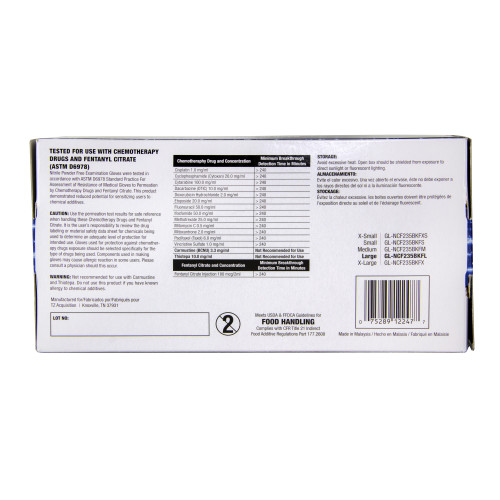 The packaging clearly displays the symbols that customers look for when choosing gloves with fentanyl and chemotherapy drug permeation protection. Tested in accordance with ASTM D6978 Standard Practice for Assessment of Resistance of Medical Gloves to Permeation by Chemotherapy Drugs and Fentanyl Citrate.