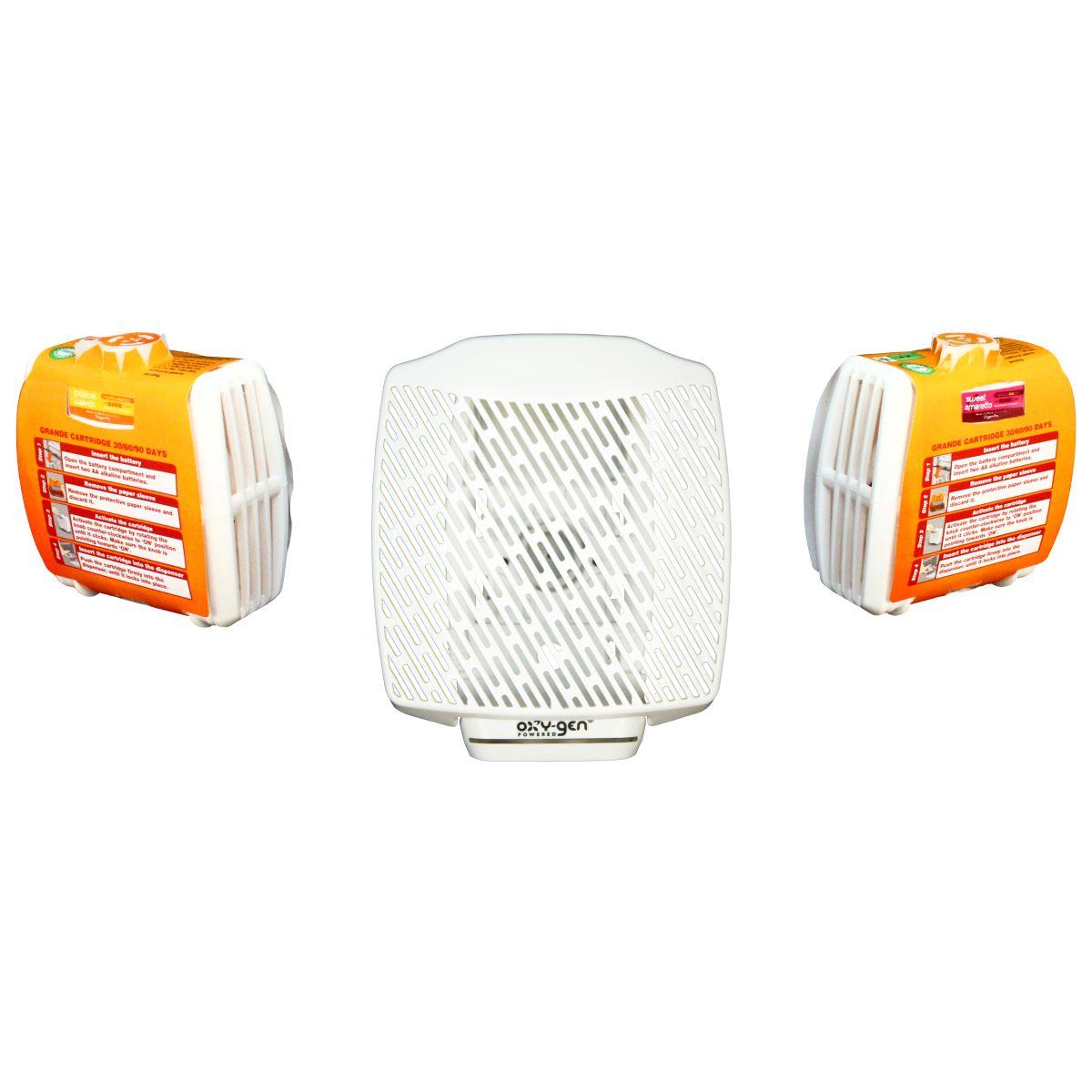 The Oxygen-Pro® Starter Kit is a complete odor control and fragrance solution designed for continuous, long-lasting freshness. Each kit includes everything needed to get started: one dispenser, two Grande cartridges for up to 120 days of odor protection, two AA batteries, and an instruction manual. Unlike traditional aerosols, gels, or sprays, the Oxygen-Pro® system uses a unique cellular diffuser and proprietary odor eliminator to deliver consistent and accurate fragrance for the whole life of each cartridge. This system effectively neutralizes odors from urine, feces, body odor, tobacco, pets, food, mold, and mildew, making it suitable for restrooms, kitchens, offices, and shared facilities. With 100% pure fragrance oils and no added solvents, alcohols, or harmful propellants, the Oxygen-Pro® is safe, eco-conscious, and carbon footprint approved. Simple twist-and-go installation and battery operation make this an economical and convenient solution for professional or home use.
