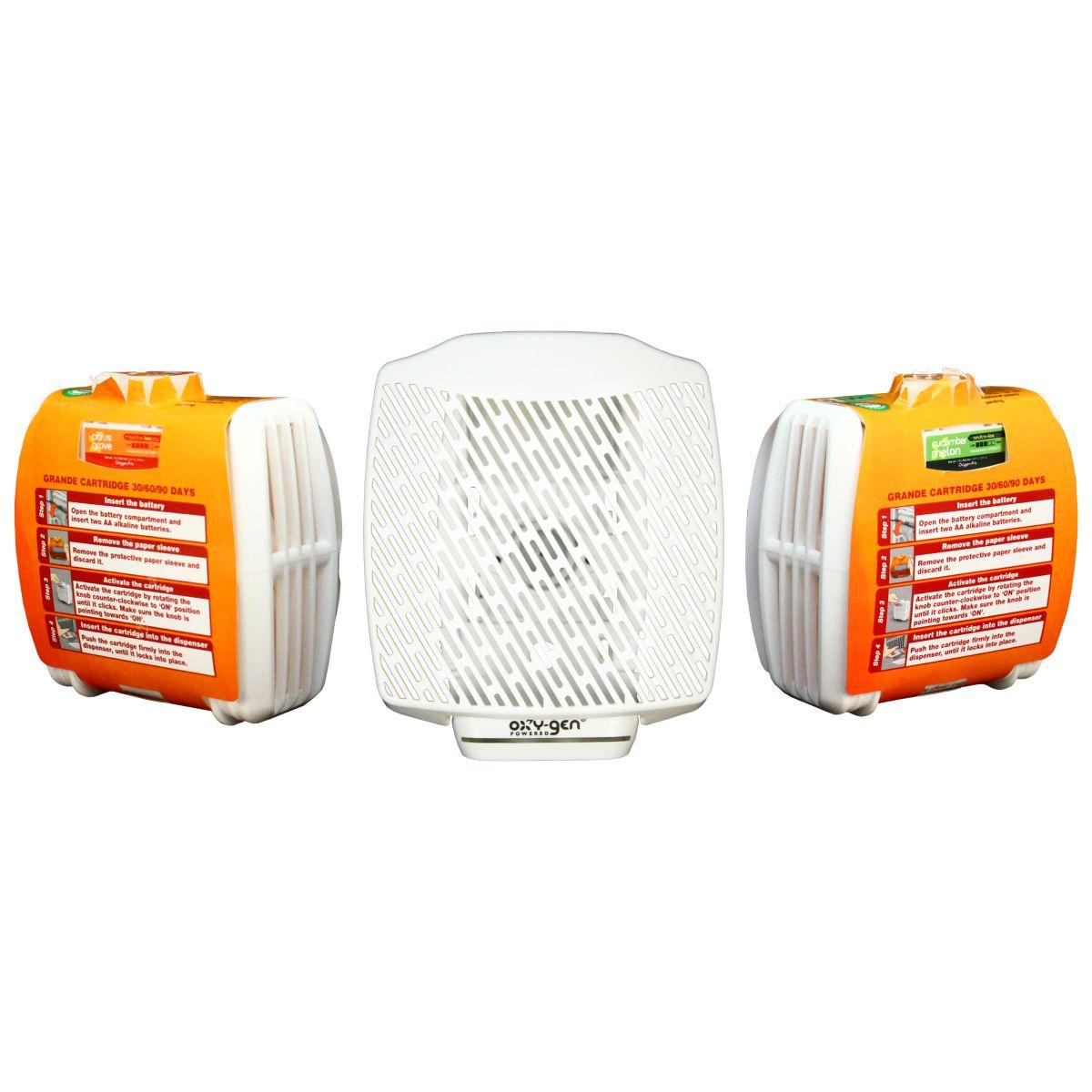 The Oxygen-Pro® Starter Kit is a complete odor control and fragrance solution designed for continuous, long-lasting freshness. Each kit includes everything needed to get started: one dispenser, two Grande cartridges for up to 120 days of odor protection, two AA batteries, and an instruction manual. Unlike traditional aerosols, gels, or sprays, the Oxygen-Pro® system uses a unique cellular diffuser and proprietary odor eliminator to deliver consistent and accurate fragrance for the whole life of each cartridge. This system effectively neutralizes odors from urine, feces, body odor, tobacco, pets, food, mold, and mildew, making it suitable for restrooms, kitchens, offices, and shared facilities. With 100% pure fragrance oils and no added solvents, alcohols, or harmful propellants, the Oxygen-Pro® is safe, eco-conscious, and carbon footprint approved. Simple twist-and-go installation and battery operation make this an economical and convenient solution for professional or home use.