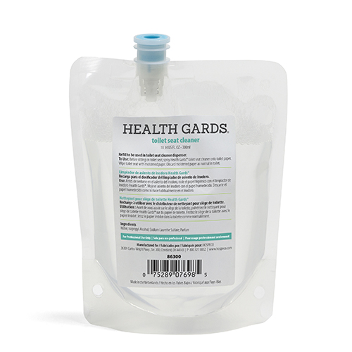 Developed to ensure washrooms meet high standards of hygiene, the Health Gards® Toilet Seat Cleaner System features a high quality, easy to use dispenser (sold separately) and a pleasantly fragranced toilet seat cleaner. To Use: Before sitting on toilet seat, spray Health Gards® toilet seat cleaner onto toilet paper. Wipe toilet seat with moistened paper. Discard moistened paper as normal in toilet.