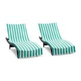 - BEACH CHAIR COVERS ARE BETTER IN PAIRS: Fellow sun lovers will admire your colorful matching chaise lounge covers when you buy some two-packs for the family and stake your claim to the best pool chairs at the club. Choose from six color stripes on a white terry ground — blue, green, grey, beige, coral, and pink. Never roam the beach endlessly looking for your chair.
