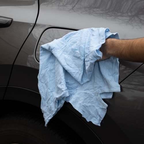 Assorted colored re-purposed t-shirts. These are light weight cotton t-shirts cut up for a low cost wipe n' toss.