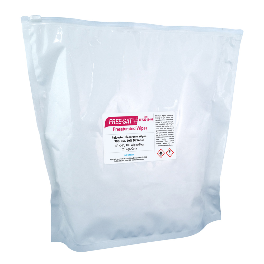 FREE-SAT® FS-VS20-44.400 4″ x 4″ pre-saturated cleanroom wipes contain 70% isopropyl alcohol / 30% DI water. Comprised of a tightly knitted virgin polyester, FREE-SAT® pre-saturated wipes are tough, abrasion resistant, absorbent, and virtually free of particle generation. They contain four clean-cut edges designed to eliminate fiber contamination, making them ideal for a variety of laboratories and controlled environments. Packaged in convenient resealable bags that help prolong wetness. Suitable for wiping small parts and tough to reach areas on equipment.