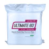 ULTIMATE 60™ Cleanroom Wipes are made from knit 100% polyester with four laser cut sealed edges. These wipes are manufactured in a cleanroom environment and cleanroom packaged. ULTIMATE 60™ single-ply cleanroom wipes are absorbent, abrasion resistant and made from 100% no-run polyester.